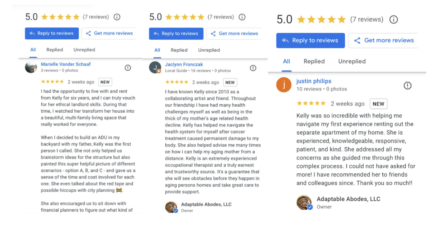 We were able to pass this detailed list on to our architect, who was able to incorporate these accommodations into our final design. We are super grateful for her insight and guidance. Her input saved us thousands of dollars and time in what would be future renovations." - Dee Roberts - 10/2024